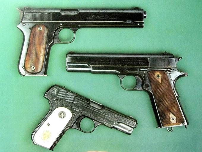 En color vemos la Colt semiautomática Hammerless de calibre .32, versión americana de 1903, junto con las Colt de grueso calibre de 1900 y 1911.