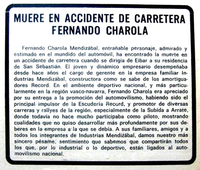 Fernando Charola Mendizábal falleció en accidente de tránsito el jueves 13 de Marzo de 1975, durante un trayecto por la autovía Bilbao/Behovia. Se desplazaba desde su fábrica en Éibar hacia su domicilio en San Sebastián cuando, en el término de Zarauz, su auto saltó el guard-rail y cayó sobre el lecho del río Urola