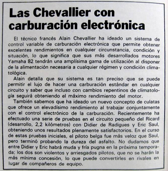 Aunque no era una figura que lograra los resultados de sus mejores rivales en las diferentes categorías (Lega, Uncini, Villa, Katayama, Herron, Ballington, Ekerold...), ni tan famoso como los ases coetáneos de 500 cm3 (Sheene, Baker, Hennen, Cecotto...), a CHEVALLIER también le pedían autógrafos los admiradores