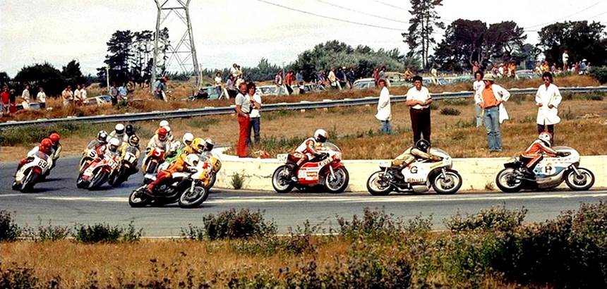 Marlboro International Motor Race Series de Nueva Zelanda, a caballo de 1974 y 1975. En la primera foto vemos un instante de la manga de Bay Park: CLEEK (dorsal letra G en su Yamaha TZ 750) sigue a Pat Hennen (letra P) y es seguido por Murray Sayle (letra H) y Phil McDonald (letra D).
