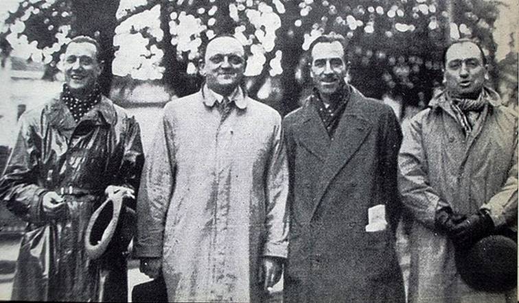 De nuevo posan juntos los cuatro amigos creadores de las Mil Millas, y en el mismo orden, aunque, esta vez, descubiertos: MAGGI, Mazzotti, Canestrini y Castagneto