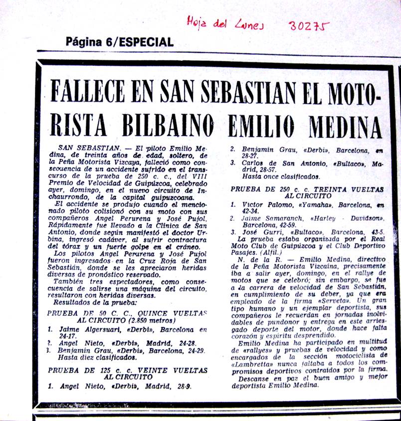 Estos pilotos resultaron con diversas heridas menores, de las que fueron atendidos en la Cruz Roja de San Sebastián, junto con tres espectadores levemente afectados por la salida de pista de otra máquina. Sin embargo, Medina, con traumatismo de cráneo y de tórax, ingresó cadáver en la Clínica San Antonio de San Sebastián. La prueba, que no se suspendió, fue ganada por Víctor Palomo, con Yamaha, seguido de Jaime Samaranch (Harley-Davidson) y José Gurri (Bultaco). Los vencedores de las otras mangas del evento serían Jaime Alguersuari en 50 cm3 y Ángel Nieto en 125 cm3.