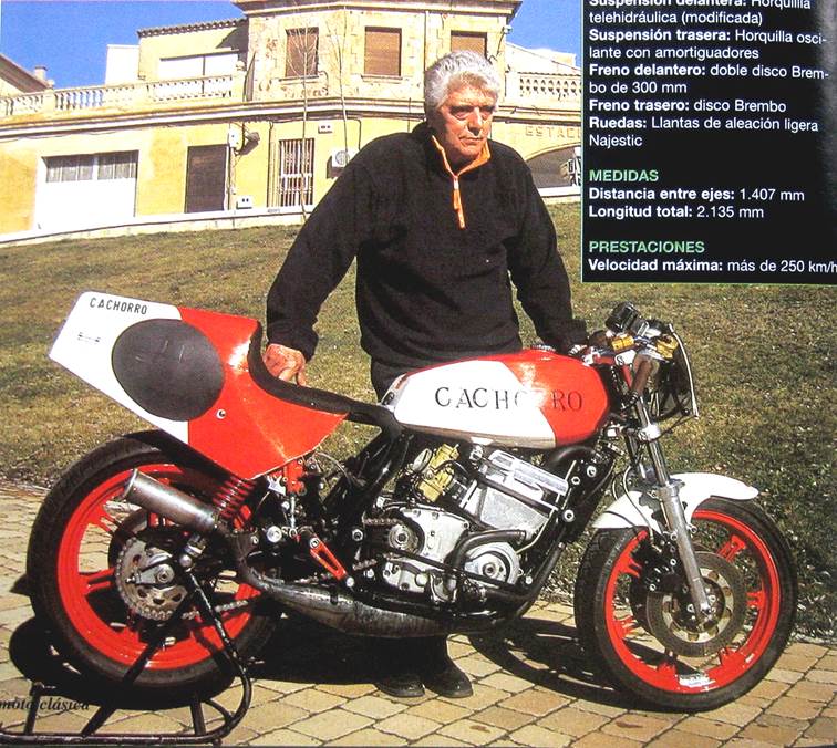 Y en 2003, posando como preparador de esta OSSA Yankee 460 Cachorro MotorRacing (2 cilindros, dos tiempos, 60 mm x 69,5 mm = 460 cm3, 11:1, 2 Dell’Orto de 34 mm, encendido por volante magnético Motoplat, refrigeración por líquido, 90 HP, > 250 Km/h)