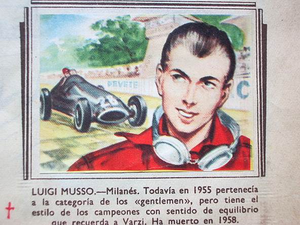 Por insistencia de su team-mate Mike Hawthorn, MUSSO utilizaba por primera vez un arnés de retención, así como un segundo barboquejo, en previsión de que se le volara el casco a 300 Km/h. El que admitiera adoptar estas precauciones suplementarias sugiere que Luigi Musso no era un kamikaze fatalista, como algunos opinaron tras su muerte