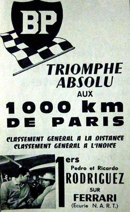 Un mes después, los Rodríguez vencerán en los 1.000 Km de París en Montlhéry, victoria apoteósica, en la general y al índice, más la vuelta más rápida (a cargo de Ricardo, que bate el antiguo record de VonTrips). Victoria que confirmará la consagración de la pareja ante el público francés. De nuevo han utilizado un Ferrari del NART, un 250 GT V12 de 2.953 cm3 y dorsal nº 5, con el que obtendrán una media de 153,6 Km/h.