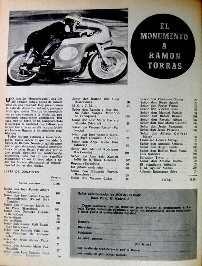 Por iniciativa de la revista “Motociclismo”, se inició en 1966 una suscripción popular para erigir un monumento al llorado Ramón TORRAS.
