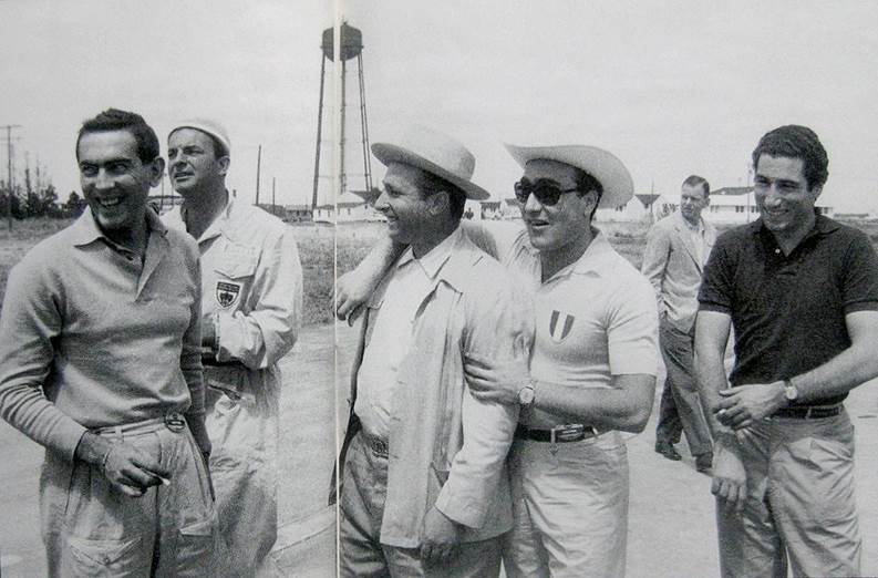 La alegre pandilla bromea en Sebring 1956: Musso, Schell, Fangio, CASTELLOTTI y DePortago.