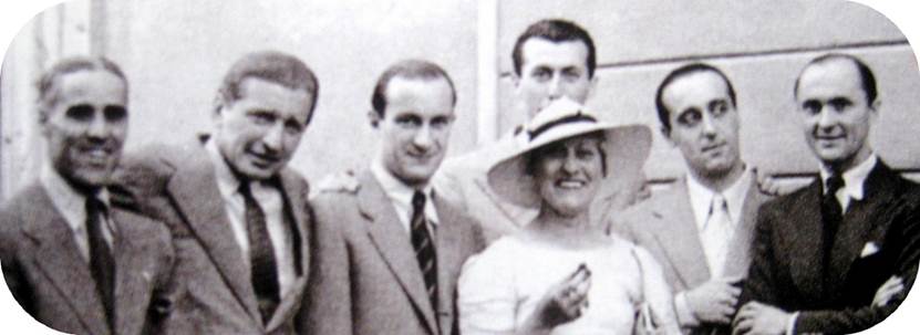 y arropada por varios otros pilotos de su generación: Nuvolari, Trossi, Brivio, Lurani, uno no identificado y Chiron