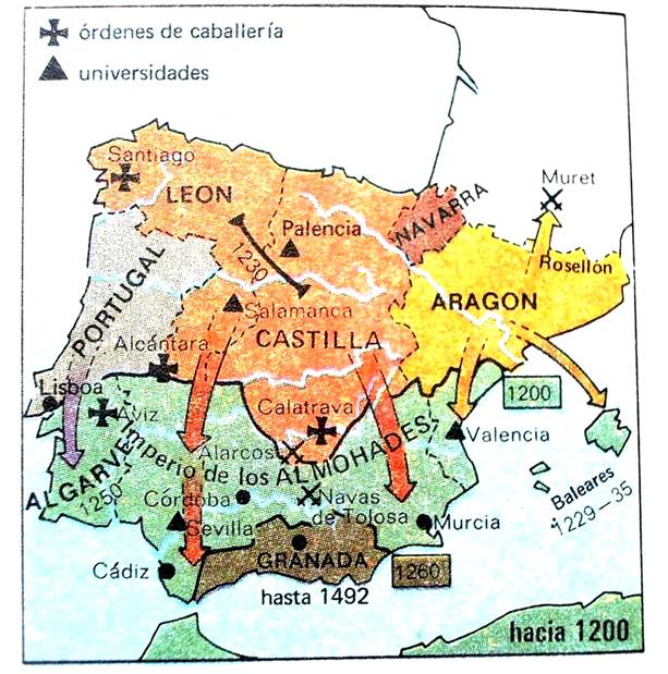 La península ibérica, hacia 1200; movimientos de la reconquista