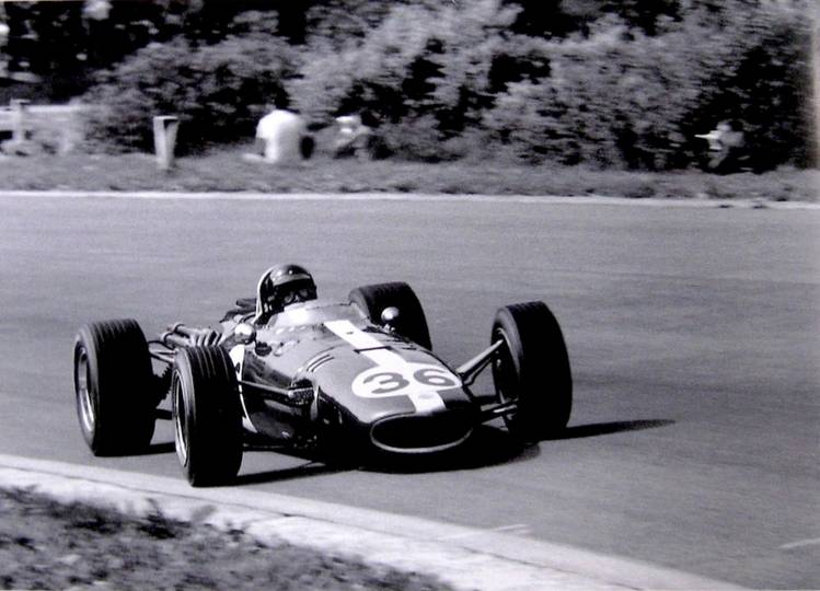 Su segundo Grand Prix sería el de Holanda, tres semanas después. Aquí las cosas no fueron tan bien: 5º en la parrilla, Mike se salió de la pista en la vuelta 11ª. En la segunda foto lo vemos poco después de la partida, en el ápice de la curva, tras Brabham (Brabham nº 16) y Jim Clark (Lotus nº 6), y en paralelo con Denny Hulme (Brabham nº 18), que salía 2º. Hulme logró aquí su primera vuelta más rápida en fórmula I, pero no pudo terminar, abandonando con fallos de encendido en la vuelta 38ª. La carrera la ganó Brabham, ante Hill, Clark, Stewart, Spence y Bandini