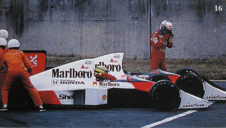 En el Grand Prix del Japón 1989, Alain Prost provocó deliberadamente un choque que dejaba parados ambos monoplazas. Se jugaban el título y, si ninguno de los dos puntuaba, éste era para Prost. Pero Ayrton fue ayudado a continuar por los comisarios y ganó la carrera, a pesar de tener que hacer una parada en el box (tercera y cuarta fotos). No obstante, la FISA de la FIA (dominadas por Jean-Marie Balestre) desclasificó a SENNA. Prost quedaba campeón, pero SENNA no pudo olvidar la afrenta.