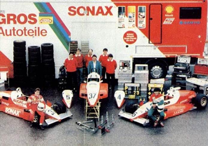 El equipo de fórmula III de Horst Schübel en 1987, con sus pilotos Bernd Schneider y Csaba KESJÁR