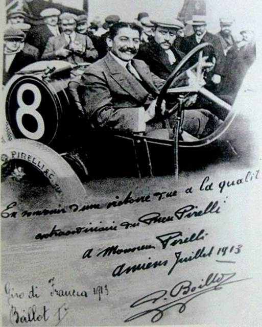En la última foto, Georges BOILLOT agradece al señor Pirelli el suministro de sus neumáticos de calidad, a los que atribuye el éxito
