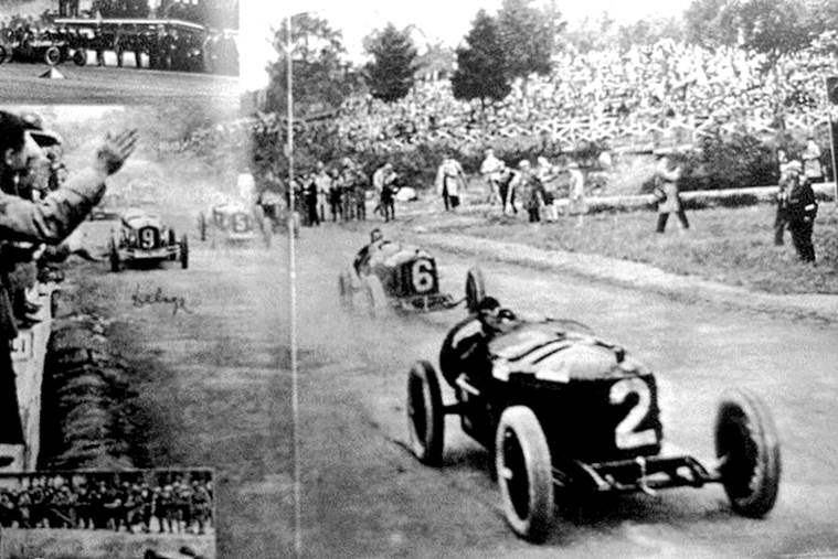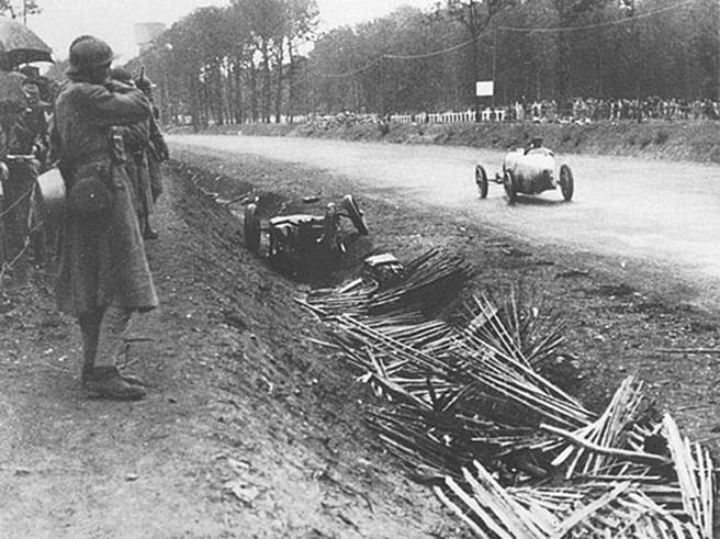 Montlhéry 1925. El Delage V12 de Divo/Benoist, que persigue a un Bugatti, se ciñe a la empalizada contra la que se matará Antonio ASCARI. De hecho, parece que su rueda trasera izquierda está rozando las estacas de la cerca