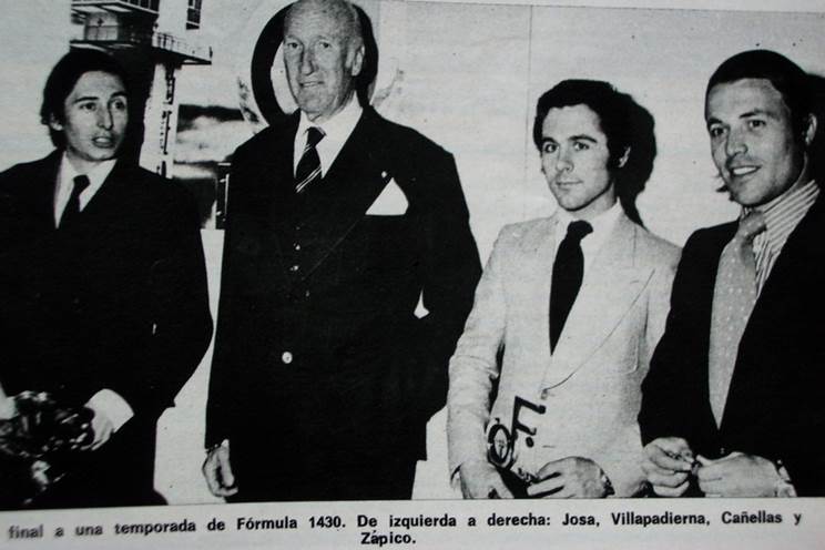 En la ceremonia de final de temporada 1971, José María Padierna, conde de Villapadierna, antiguo piloto de Grand Prix y presidente de la FEA, posa con Josa, Cañellas y Zapico, que adoptan para la ocasión una actitud formal y su mejor apariencia (fingida) de muchachos prudentes