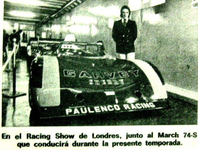 RODRÍGUEZ ZAPICO posa en Londres con el March 74S Garvey Sherry del Paulenco Racing que pensaba utilizar en 1974 con los colores de Garvey.