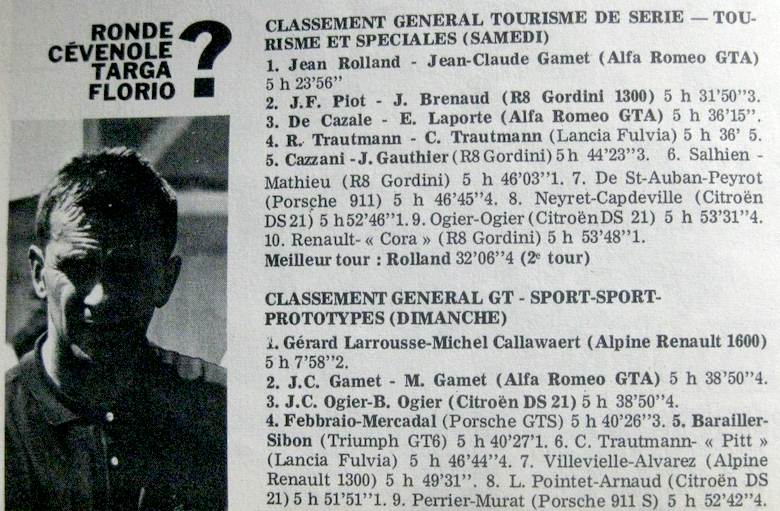 Victoria en categoría Turismo y Especiales de Jean ROLLAND/Jean-Claude Gamet en la Ronda Cévenole 1967, una prueba que había variado su formato hasta hacerse semejante a la Targa Florio.