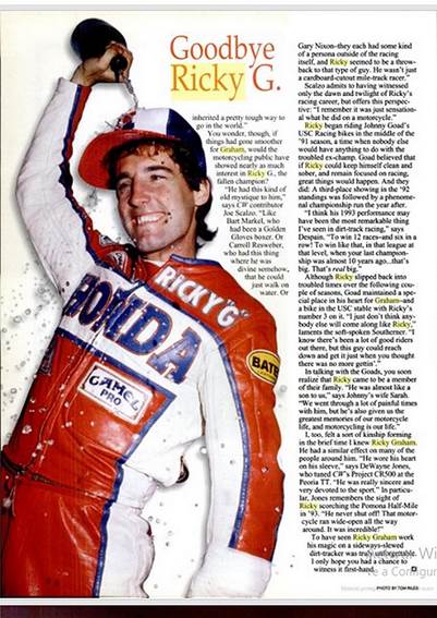 Don Canet “Goodbye Ricky G.” en Cycle World [https://books.google.es/books?id=dzSElH5E4AQC&pg=RA4-PA9-IA33&lpg=RA4-PA9-IA33&dq=Ricky+GRAHAM+(1958-1998)&source=bl&ots=ni_b0Da7Im&sig=ACfU3U3vO4CBkrHvjdPjrAB5Gm_HKCluGQ&hl=es&sa=X&ved=2ahUKEwjOjqXjn5v1AhWUBmMBHUWSDAUQ6AF6BAgaEAM#v=onepage&q=Ricky%20GRAHAM%20(1958-1998)&f=false]
