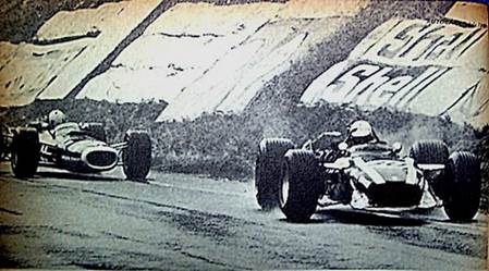 En la foto lo vemos en contravolante ante el BRM de Dickie Attwood