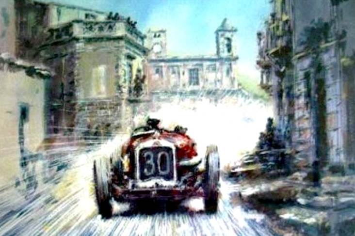 una pintura y un cartel de los héroes de la XXI Targa Florio 1930