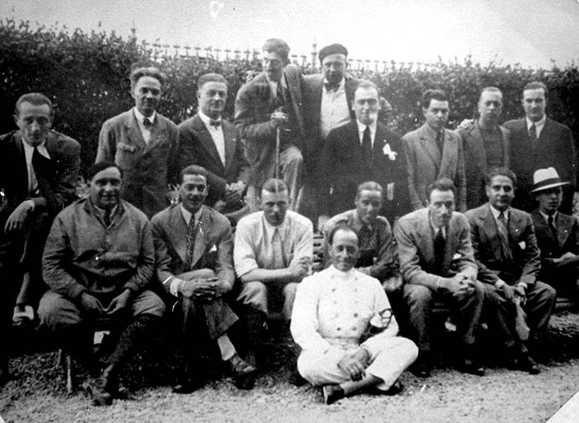 En la foto inferior, sentados en el banco: Campari, Gianferrari, Varzi, Nuvolari y otros tres