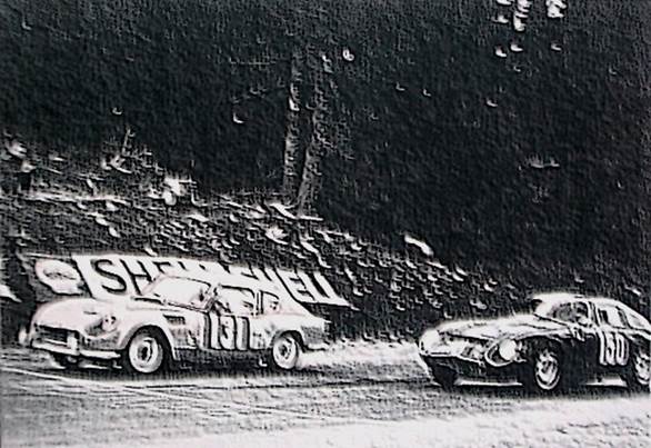 En el Tour Auto 1964, el Alfa Romeo TZ nº 150 de Jean Rolland está a punto de rebasar al Triumph Spitfire GT nº 131 de SLOTEMAKER durante las últimas rampas de la Côte de Chamrousse