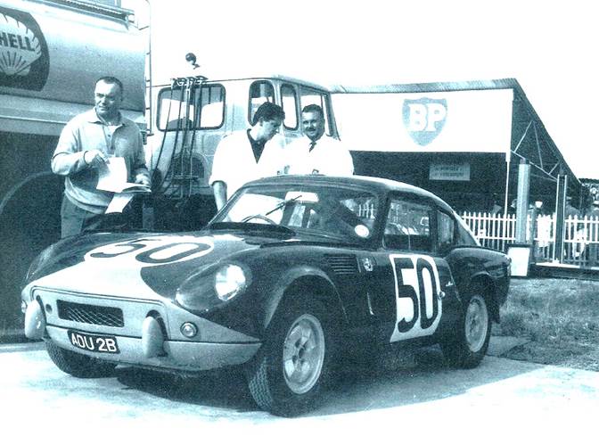 Con un Triumph Spitfire GT en la primera fotografía, con un monoplaza en la segunda, con un Alfa Romeo 33 en la tercera, con un fórmula Ford en la cuarta…